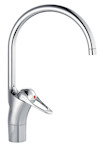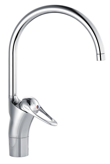 Mjukstängande 1-håls köksblandare med keramisk tätning som eliminerar dropp. Inbyggd, lätt omställbar flödesbegränsning och temperaturspärr. Blandaren har kallstartfunktion vilket innebär att när blandaren öppnas med spaken i normalläge (spaken rakt fram) så kommer endast kallt vatten. Ingen tappning av varmvatten sker förrän man för över spaken till vänster. Detta reducerar den onödiga varmvattenspolningen och minimerar risken för ofrivillig varmvatteninblandning i dricksvattnet. Hög, svängbar pip (C-pip). Spärrbricka medföljer för 60º, 85º, 110º eller 360º. Med Soft Pex-rör.