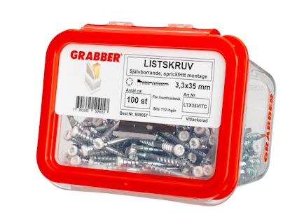 Listskruv 3,3x35 med borrspets. Sprickfritt montage. För invändigt bruk. Läs mer