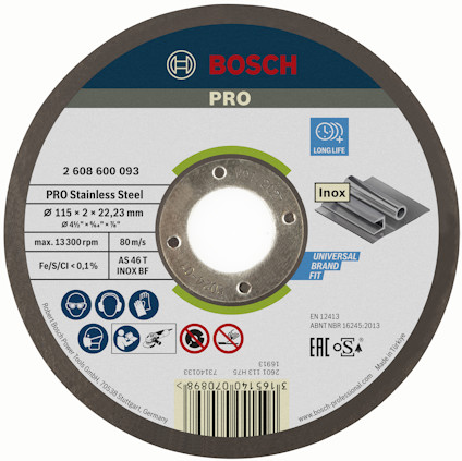 Expert for Inox Rapido kapskiva utför snabb kapning med maximal säkerhet i rostfritt stål. Skivan är tillverkad av förstklassig aluminiumoxid med funktionella fyllnadsmedel och tillsatser i en modern fenolhartsmatris. Dessutom är den tunna skivan fri från fyllnadsmedel som innehåller järn, svavel och klor. Maximal säkerhet under arbetet möjliggörs tack vare det precisionstillverkade glasfibernätet. Använd den här skivan för kapning av rostfritt stål. Bosch kapskivor uppfyller de högsta säkerhetskraven, till exempel EN 12413, FEPA och oSa. Den är kompatibel med vinkelslipar.