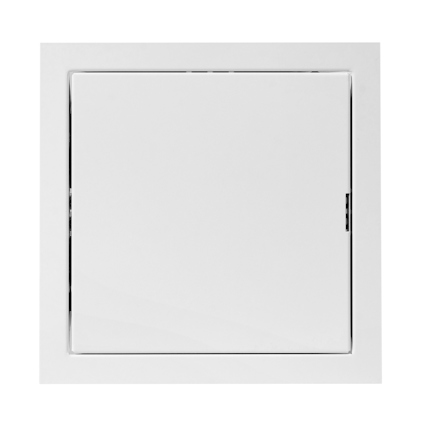 Ej brandklass. Lucka för konstruktioner med ett resp två lag 12,5 mm gipsskivor. Försedd med gångjärn (2 stålnitar). Tillverkad av galv. plåt, 0,7 mm. Slits för öppning med hjälp av en mindre skruvmejsel. Kulör: Pulverlackerad Vit. Gångjärn placerat i den långa sidan.